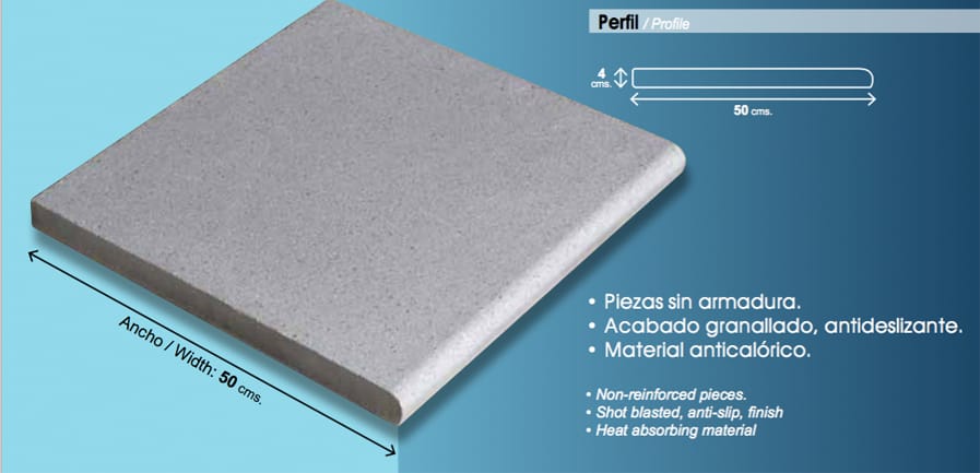 Borde de piedra reconstituida antideslizante y atérmico. Excelente terminación sin orificios en la superficie. Dimensiones: 50x50x4cm. Esquineros disponibles. Colores Disponibles: Blanco, Crema y Gris**Bajo ciertas condiciones específicas el color gris puede perder sus cualidades atérmicas.